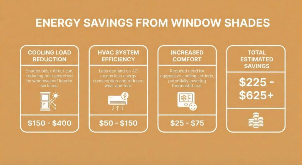 | Cooling Load Reduction | Shades block direct sun, reducing heat absorbed by windows and interior surfaces. | $150 – $400 |