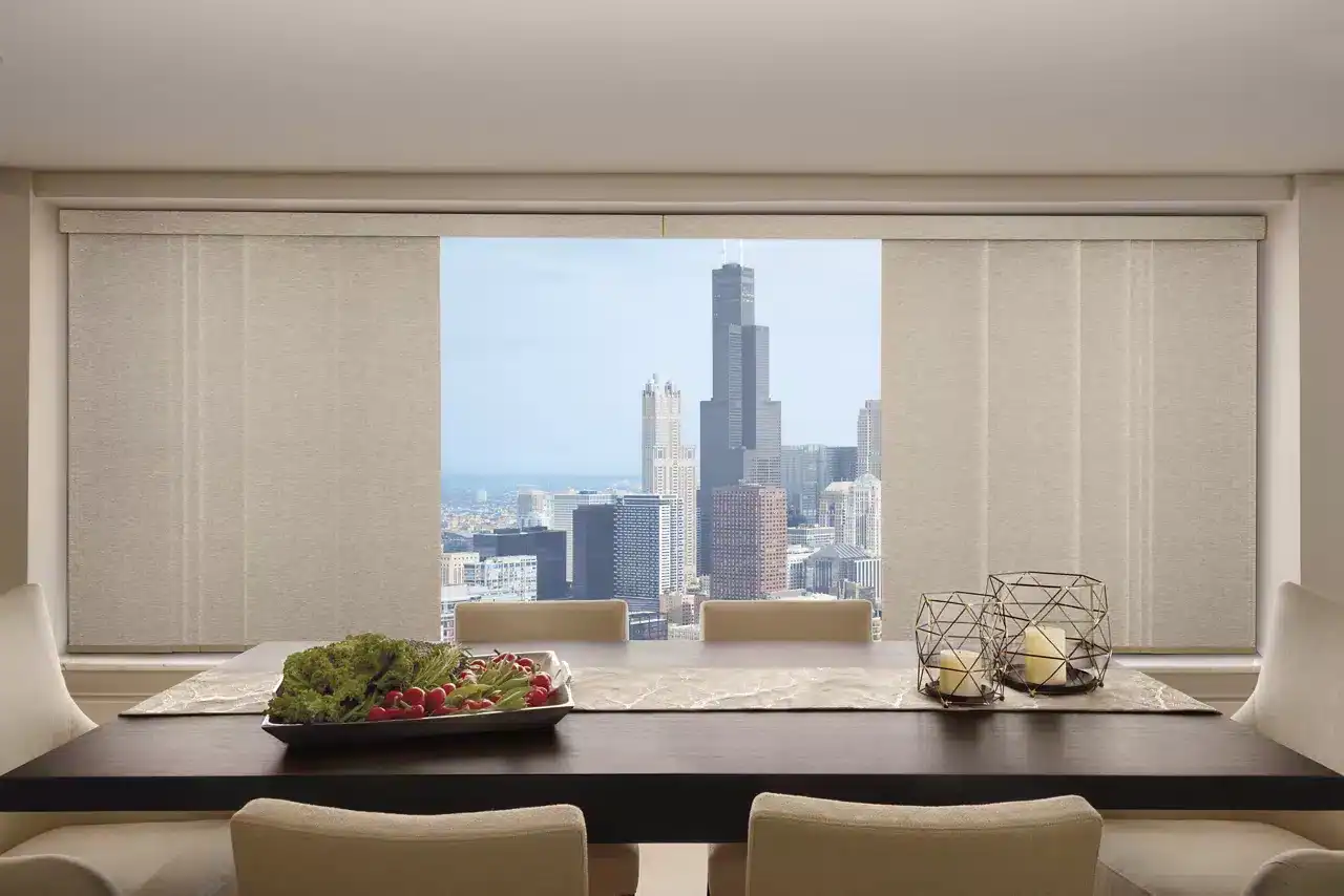 Skyline® Gliding Window Panels are a stylish, modern choice for wide windows and sliding glass doors. Their sleek fabric panels offer excellent light control and privacy while adding a bold, contemporary touch to your space. When open, the panels stack neatly for an unobstructed view. When closed, they create a smooth, polished look that complements any interior design.