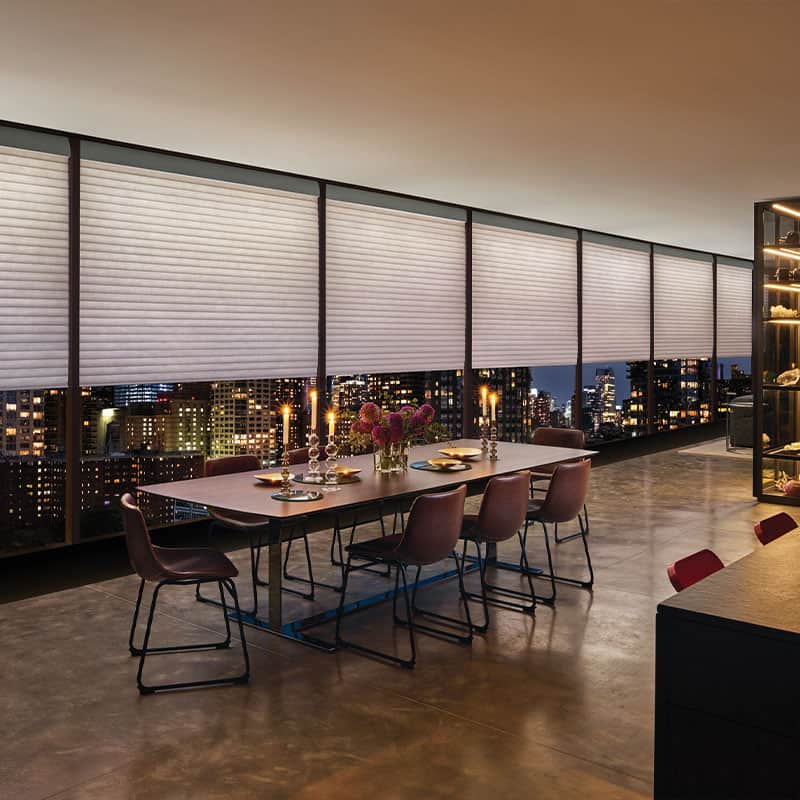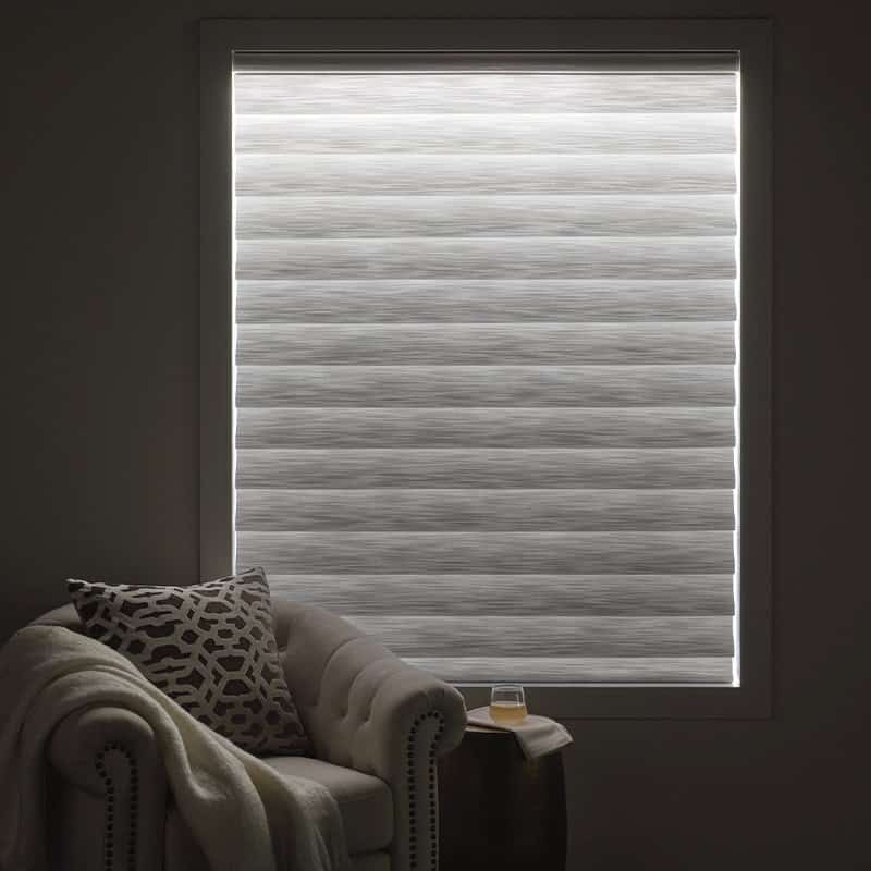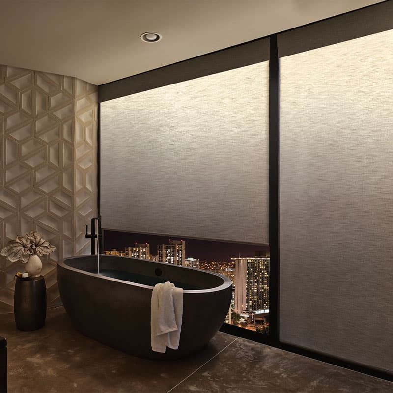 Aura™ is a contemporary design feature that pairs high-quality fabrics with a clean, architectural headrail. Integrated accent lighting gently illuminates the shade from behind, creating a soft, ambient glow that enhances the mood of any room. Even when the shades are closed, the lighting adds depth and character, turning your window coverings into a standout design element.