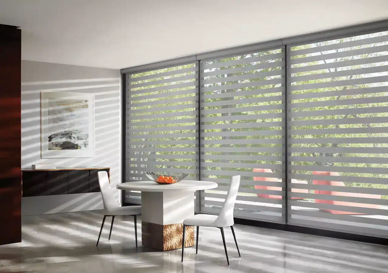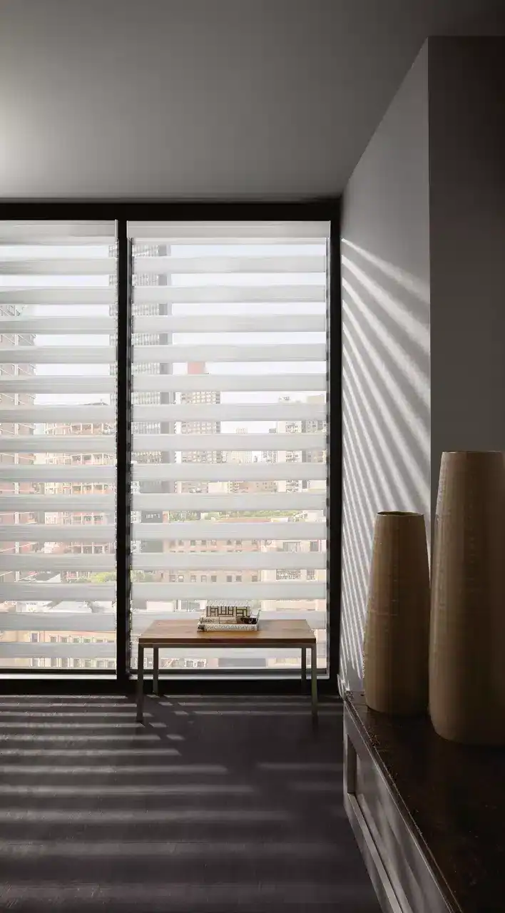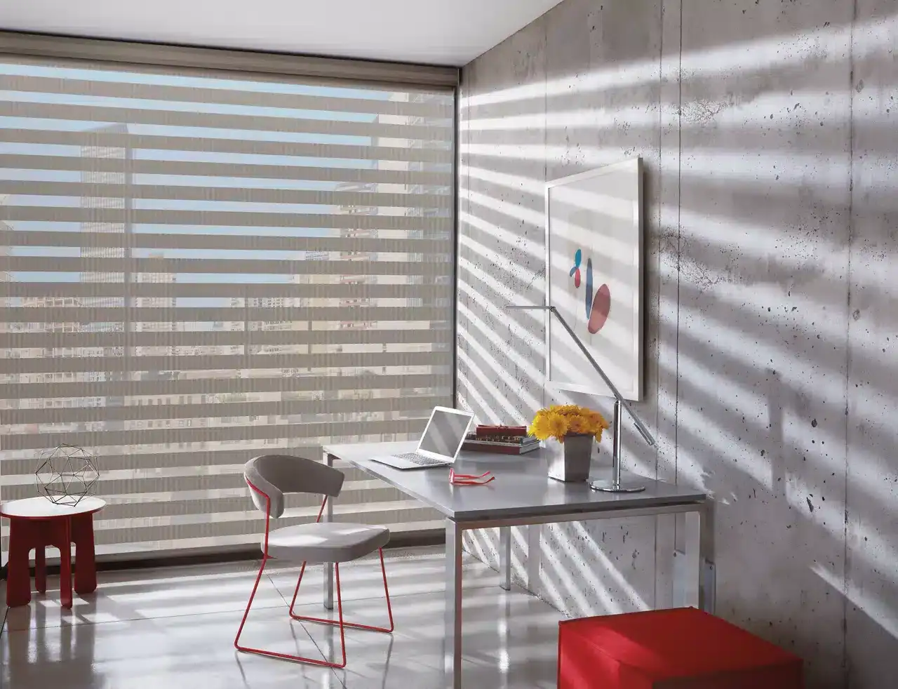 Designer Banded Shades combine modern style with smart functionality using alternating sheer and solid fabric bands. When the solid bands line up, you get full privacy. When the sheer and solid bands alternate, natural light filters in while still allowing a view outside. This innovative design lets you adjust light and privacy with a simple shift, without raising or lowering the entire shade.