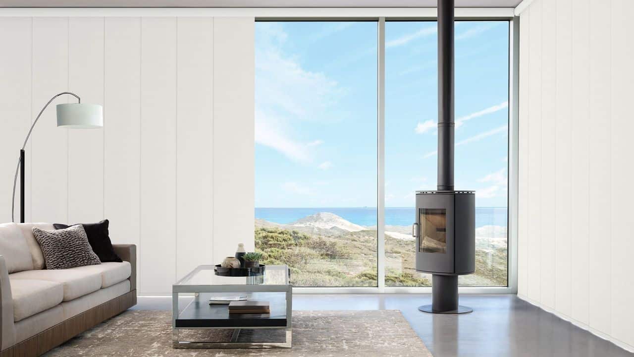Modern living room with large glass windows showcasing scenic coastal views, featuring Superior Blinds for stylish window treatment solutions.